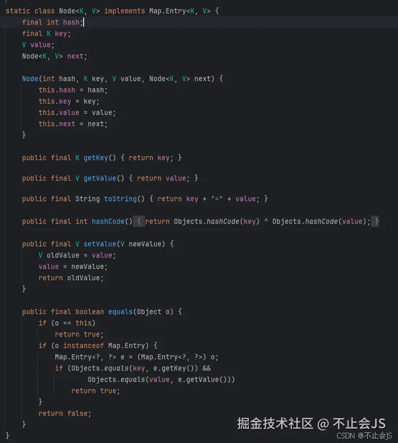 其中Node类就是我们保存的一个值,而tab是Node的数组,也可以知道他就是最终保存数据的结构,其中Node类内容如下