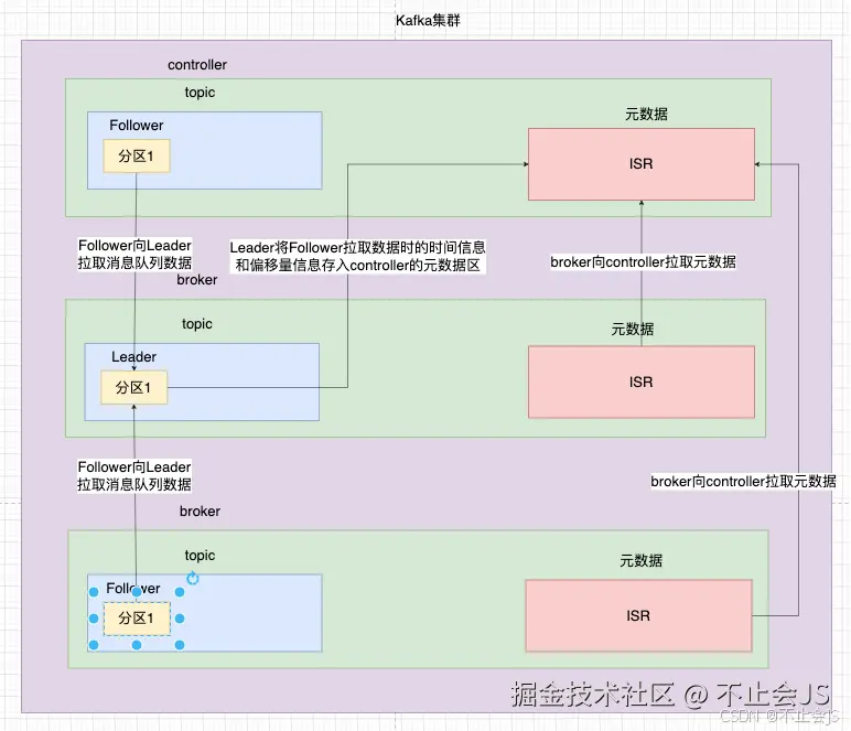 在上文中我们讲述了主题副本分区中的Leader和Follower的角色和相关功能,其中Leader 副本负责处理所有的生产请求,并将数据写入自己的日志中。Follower 副本则从 Leader 副本同步数据,将其写入到自己的日志中。当Follower在同步Ledaer的数据时,Leader会讲这次同步的Follower,其同步数据的偏移量以及同步的时间的映射关系通过controlelr节点,再由controller节点存入元数据中的ISR数据列表。当Leader将新的偏移量和时间存入ISR中时,ISR不仅会更新数据,还会检查当前内部保存的Follower的同步数据偏移量和时间是否和Leader日志中的偏移量和当前时间相差太多(配置中的 replica.lag.max.messages和 replica.lag.time.max.ms),如果超过预期值则会将该Follwer从ISR踢出。