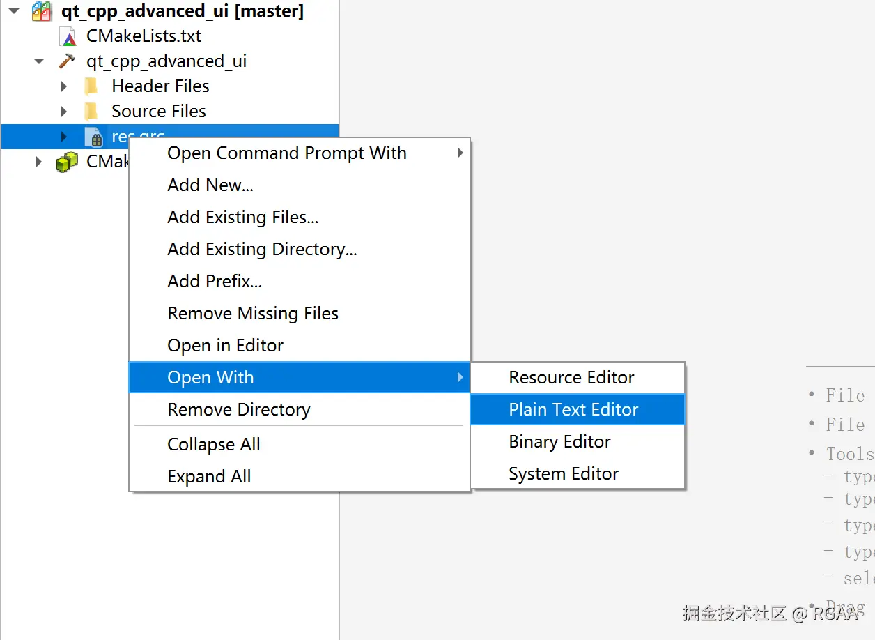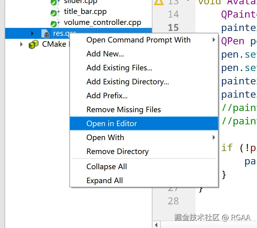 1.6.1 用Qt自带编辑器,在res.qrc上直接右键,选择 Open in Editor