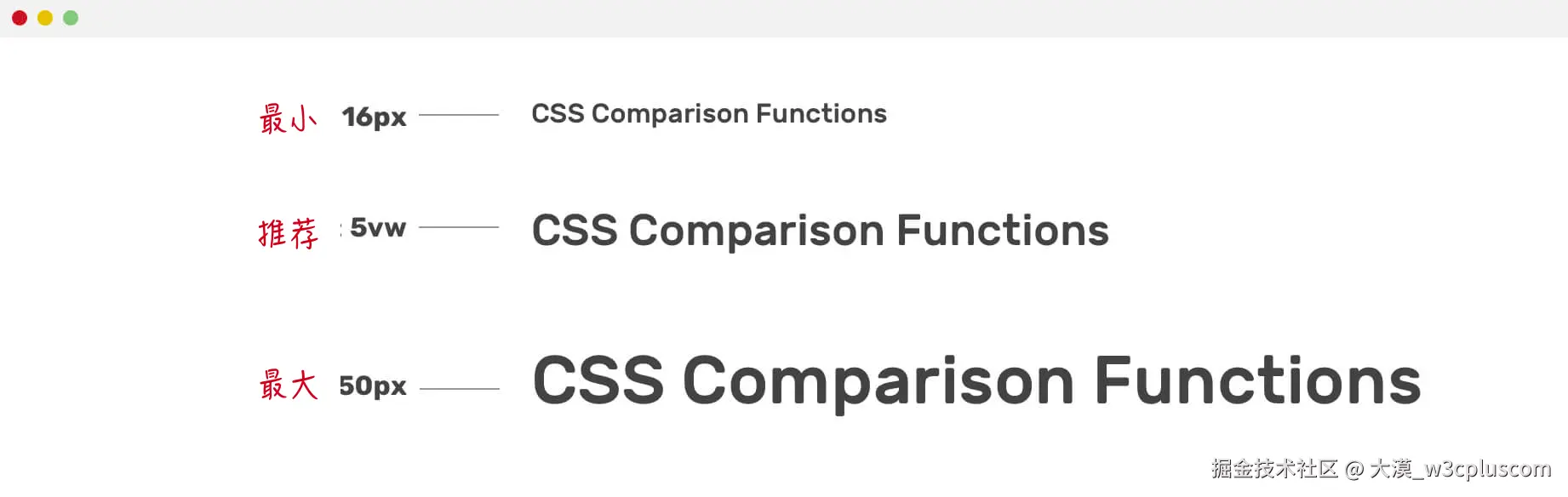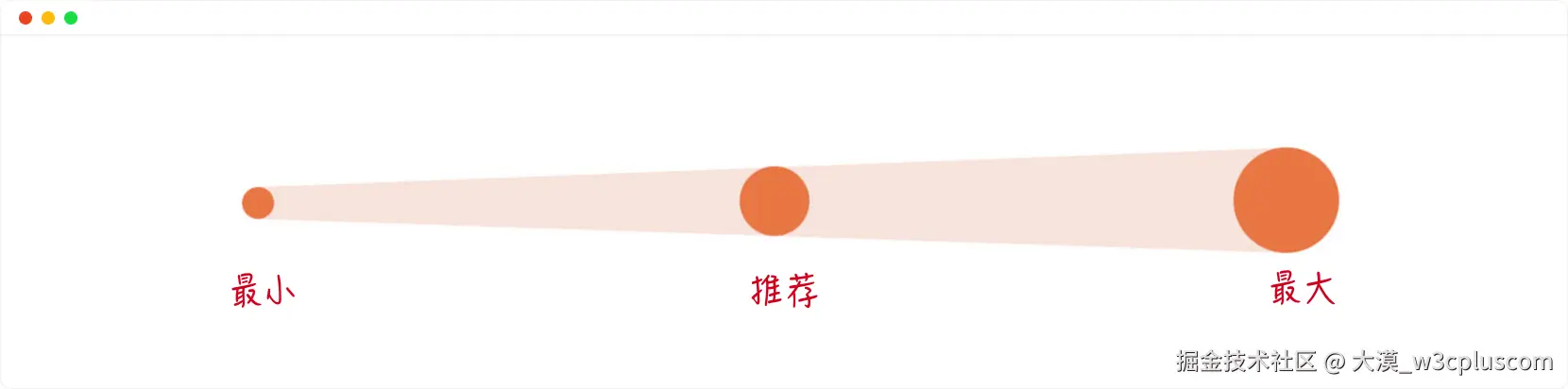 那现在,基于 CSS 比较函数相关特性,Web 设计师可以像下图这样提供设计。比如,提供最小、最大和推荐三种状态下的设计风格:
