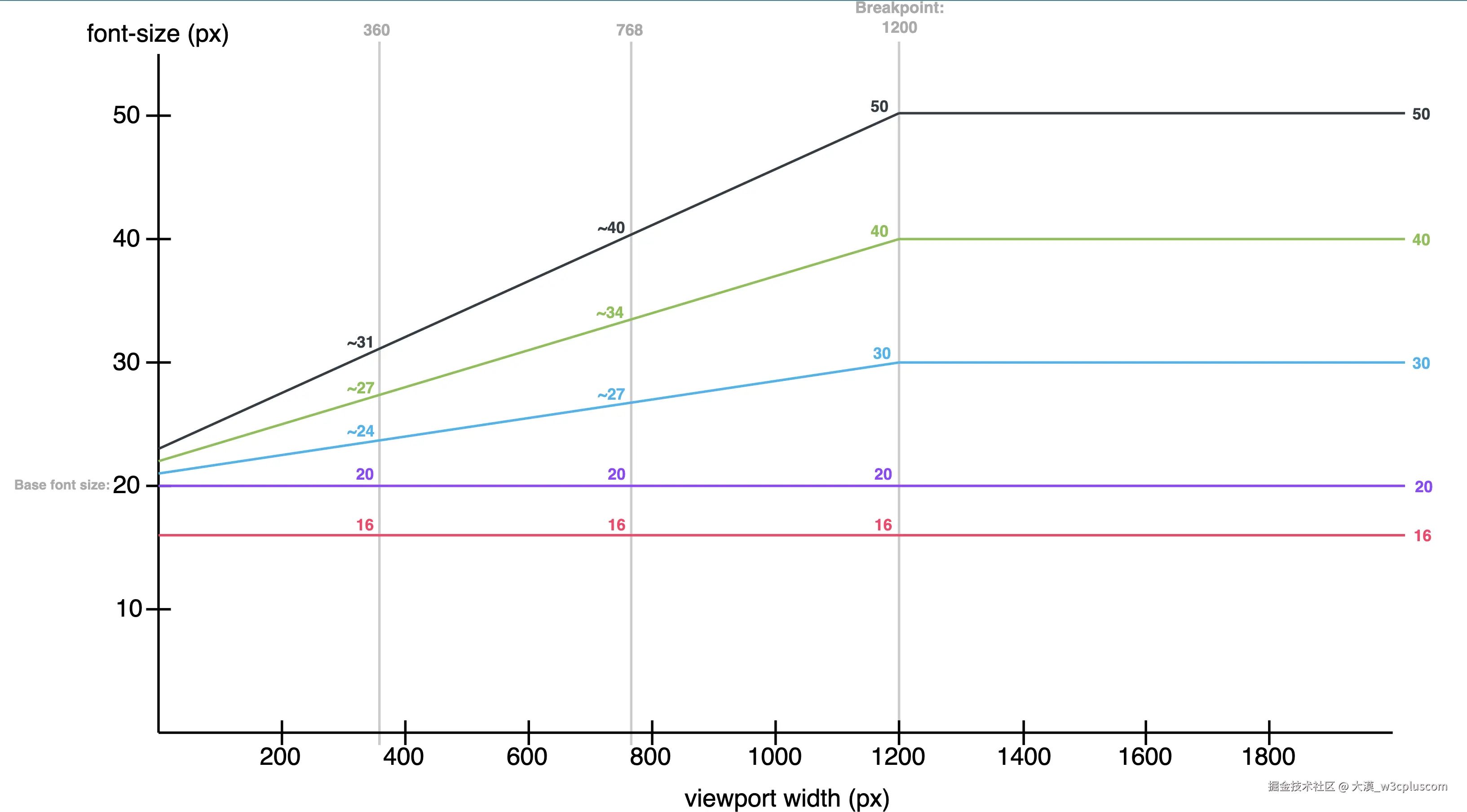 比如,我们在低于320px(minw)使用的font-size是20px(minf),而高于960px(maxw)使用的font-size是40px(maxf);在断点320px ~ 960px之间采用的font-size是20px ~ 40px(minf~maxf),用水位图来描述的话像下面这样:
