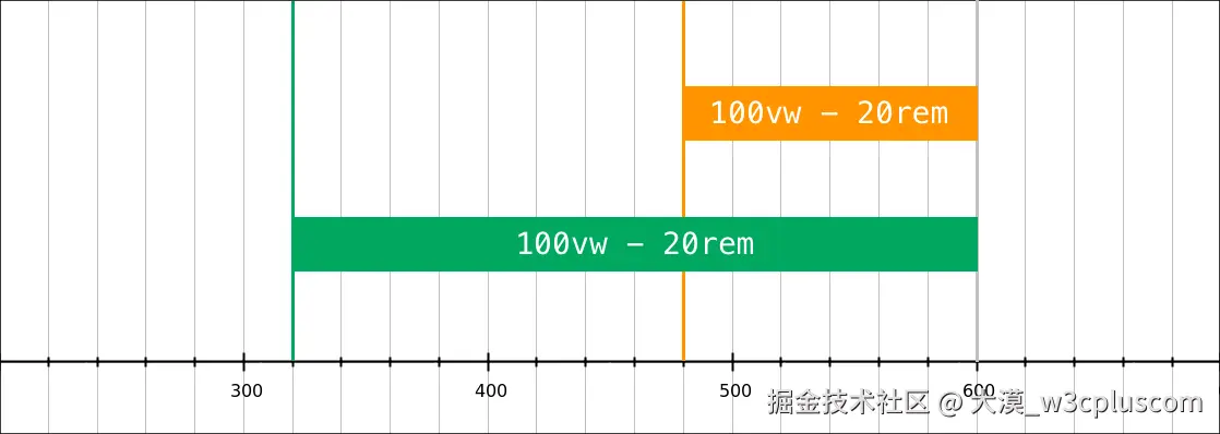 先回到100vw - 20rem的计算,该计算可以正常,并将返回一个像素值。为什么呢?我们来看一个小示例。如果基本字体的大小是16px,那么视窗的宽度就是600px,结果将是280px(600 - 20 × 16 = 280);如果基础字体大小是24px,视窗宽度为600px,则结果为120px(600 - 20 × 24 = 120)。