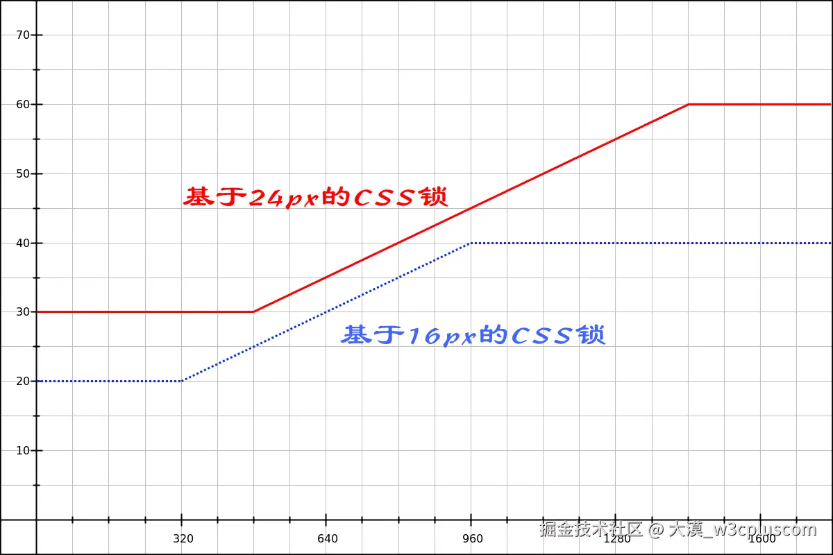 用到CSS锁上来的话,就是CSS锁允许你设置最小和最大的字体大小。最小字体大小将应用于最小视窗宽度以下,最大字体大小将应用于最大视窗宽度之上,在最小宽度和最大宽度之间,字体大小将按比例从最小字体到最大字体间按一定的比例缩放: