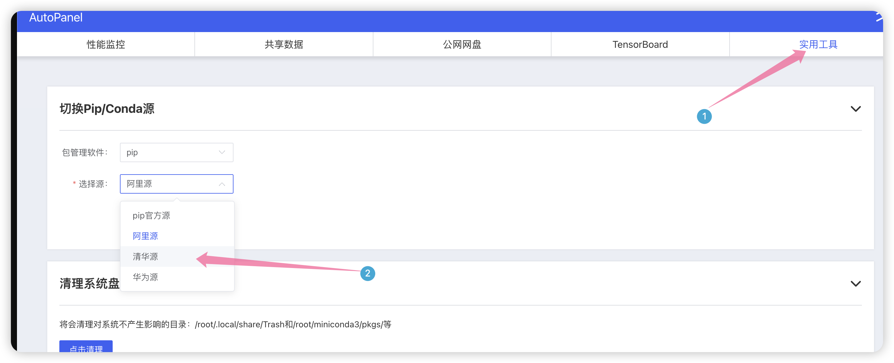创建好以后就来到了控制台,点击AutoPanel 面板,设置默认为清华源。