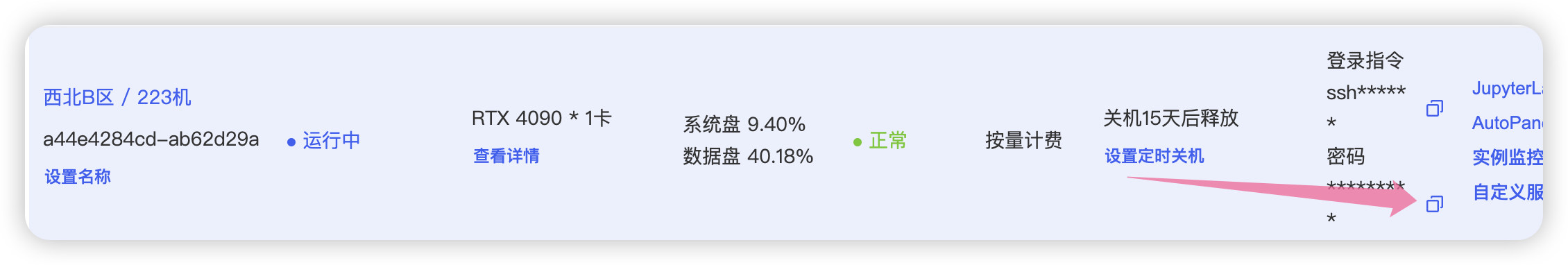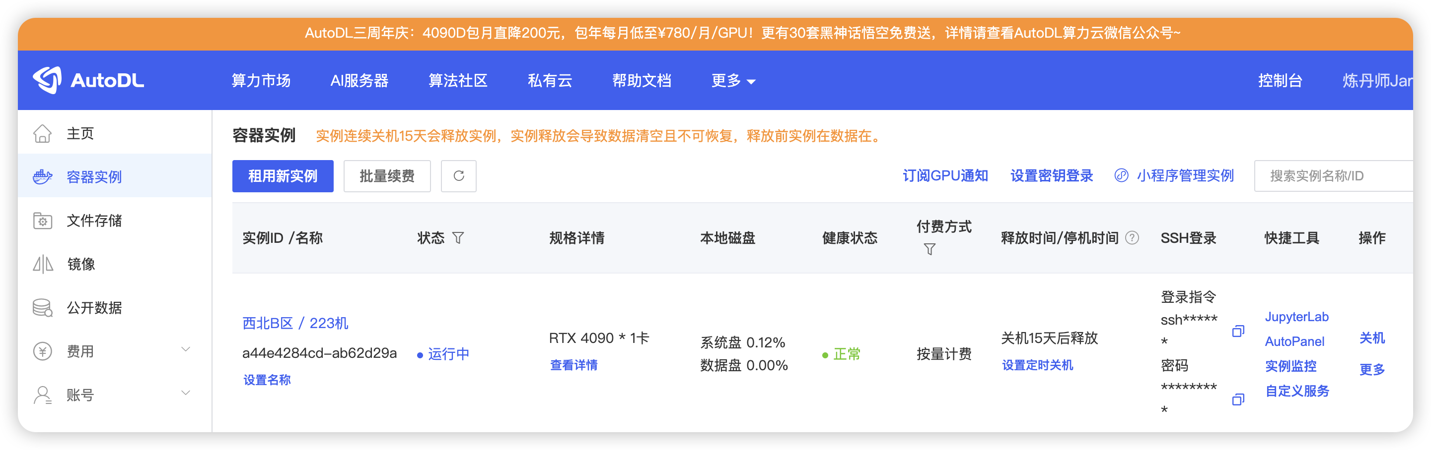 直接到算力市场,选择按量计费,地区随便选择一个,这里使用4090显卡。