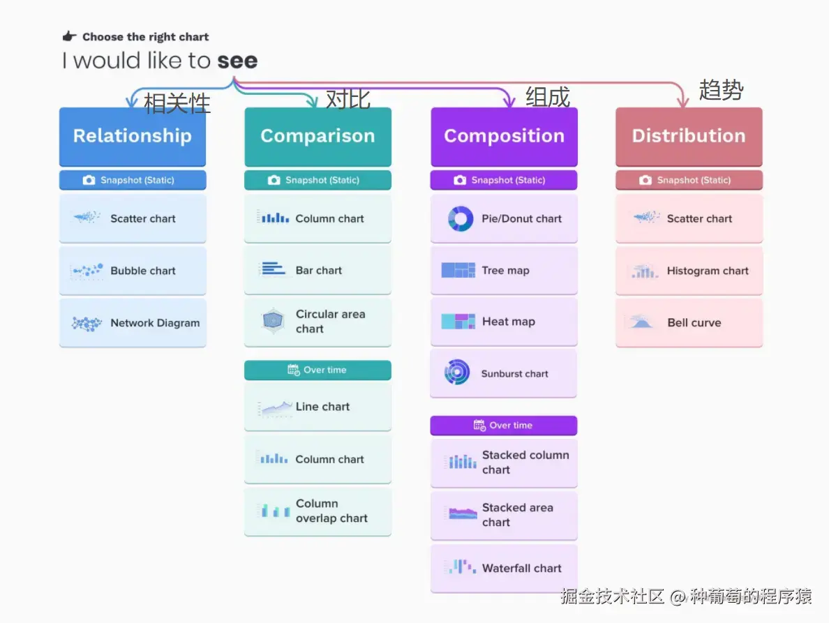 你想要给观众展示什么,这是最重要的选择依据,下面给大家列举了的十几种图表类型。