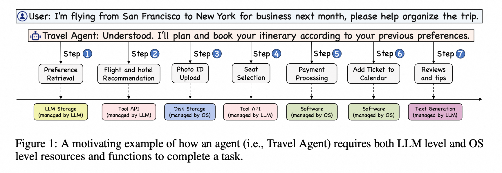 Figure 1 通过这个例子,展示了LLM基础代理如何结合LLM的高级认知功能和操作系统的传统计算功能,以实现复杂任务的自动化和优化。这种协同作用不仅提高了任务执行的效率,还增强了用户体验。