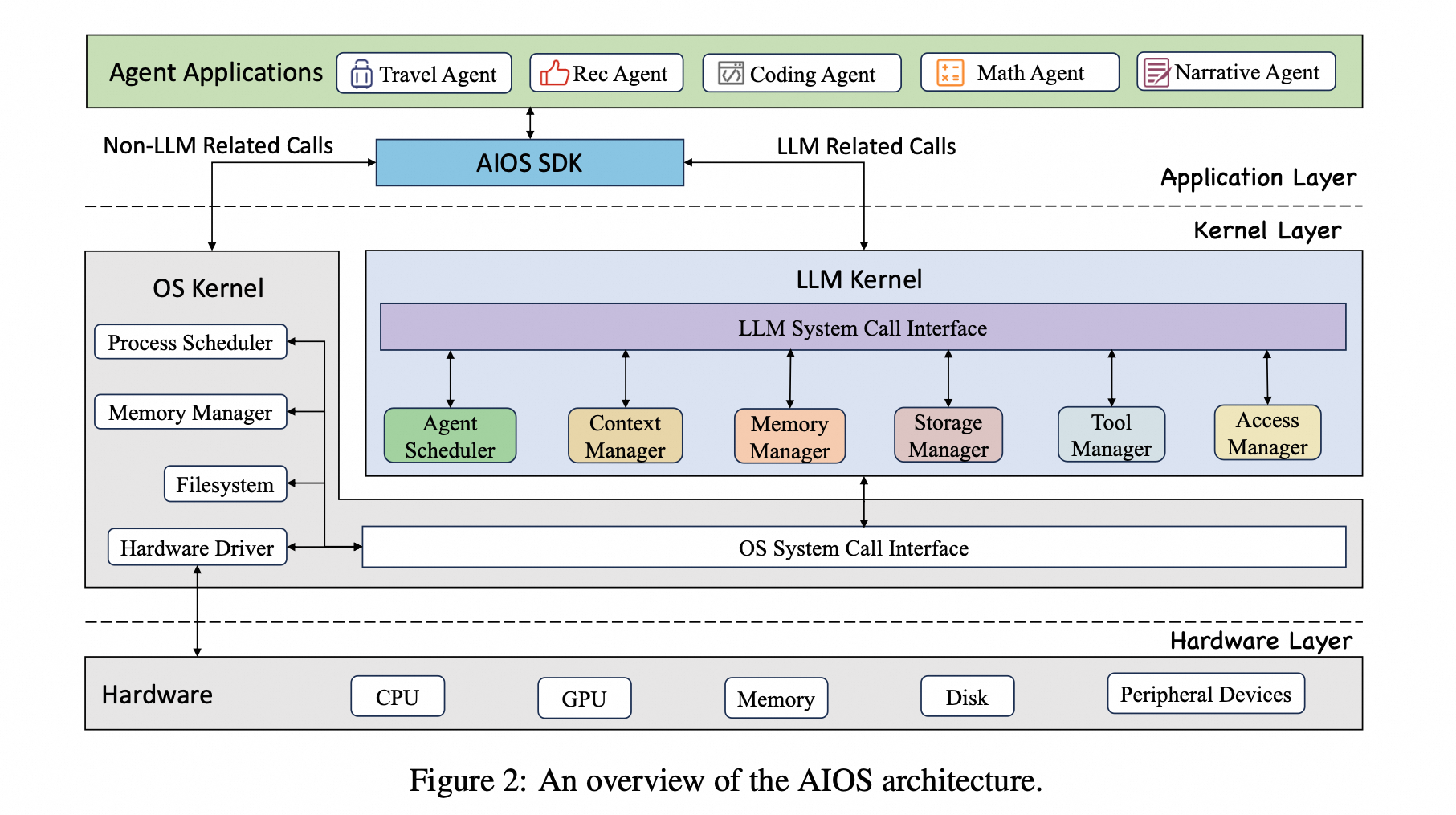 Figure 2 通过展示AIOS的三层架构,阐明了如何将LLM的强大功能与操作系统的资源管理能力结合起来,以支持复杂任务的自动化和优化。这种设计使得AIOS能够高效地管理和协调LLM代理的活动,同时确保系统的安全性和模块化。