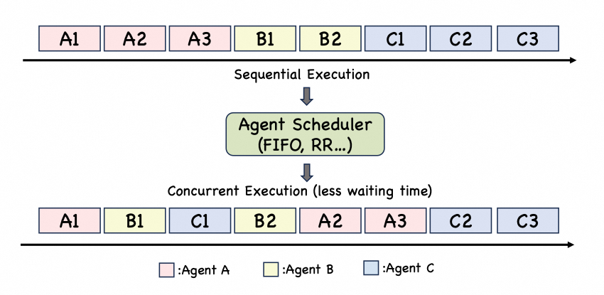 - 「并发执行支持」:AIOS允许多个代理并发执行,提高了资源的利用效率,并减少了瓶颈。