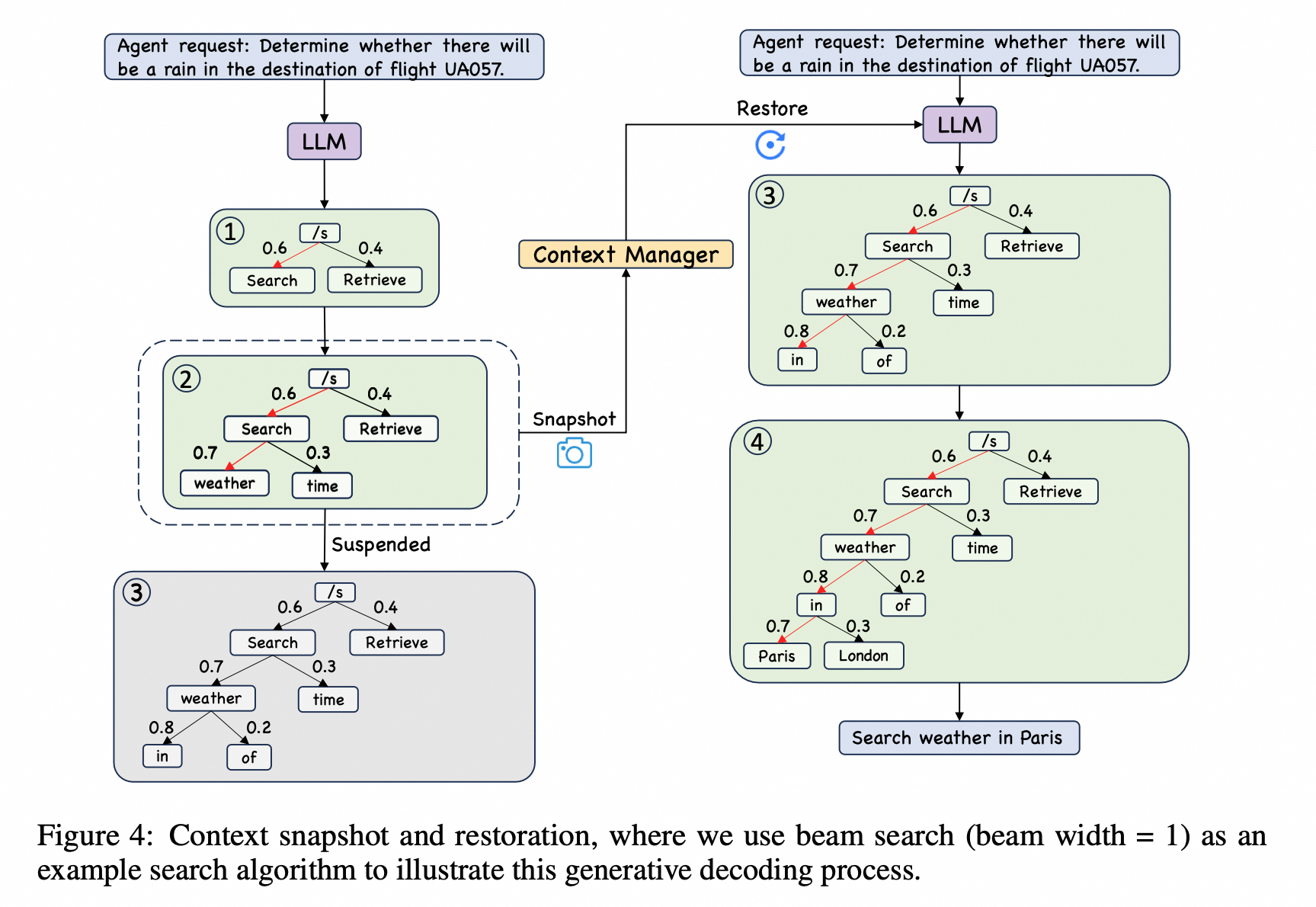 - LLM在处理这个请求时,上下文管理器在不同的时间点进行了快照和恢复操作,以确保即使在暂停和恢复过程中,也能准确完成最终的响应:“Search weather in Paris.”(搜索巴黎的天气。)