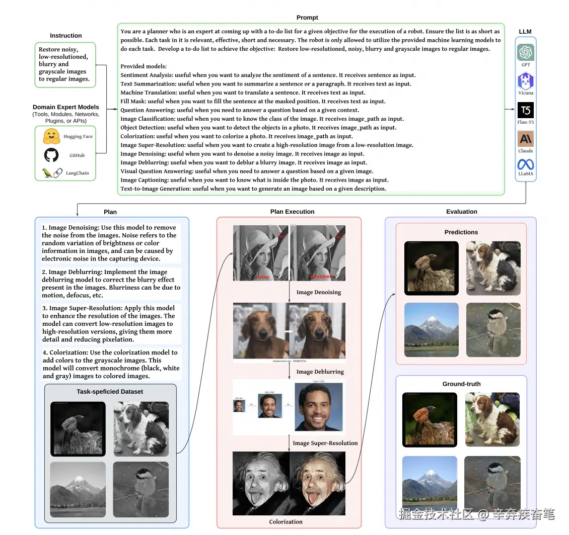 - 「计划执行」:根据LLM生成的计划,选择合适的领域专家模型(工具、模块、网络、插件或API)来执行任务。例如,使用图像去噪、去模糊、超分辨率和着色模型来处理图像。