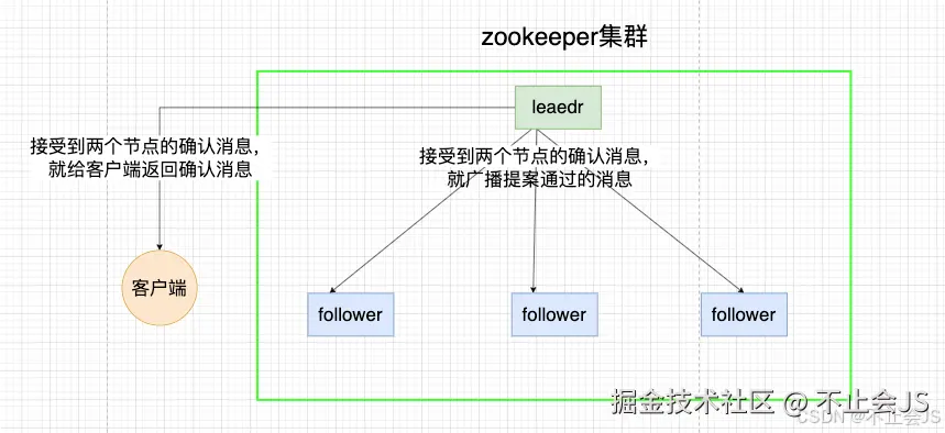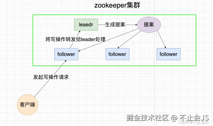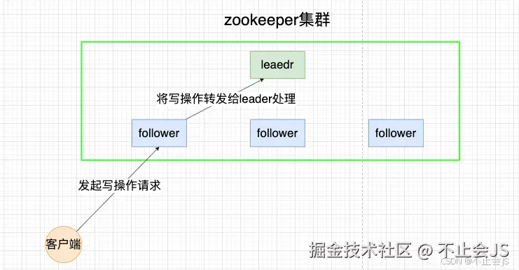 在Zookeeper集群中,只有leader节点能够处理写操作,其他的follower节点都只能处理读操作,但其并不是不能接受写请求,当接收到写操作的请求时,follower节点会讲这个请求转发给leader节点来处理。