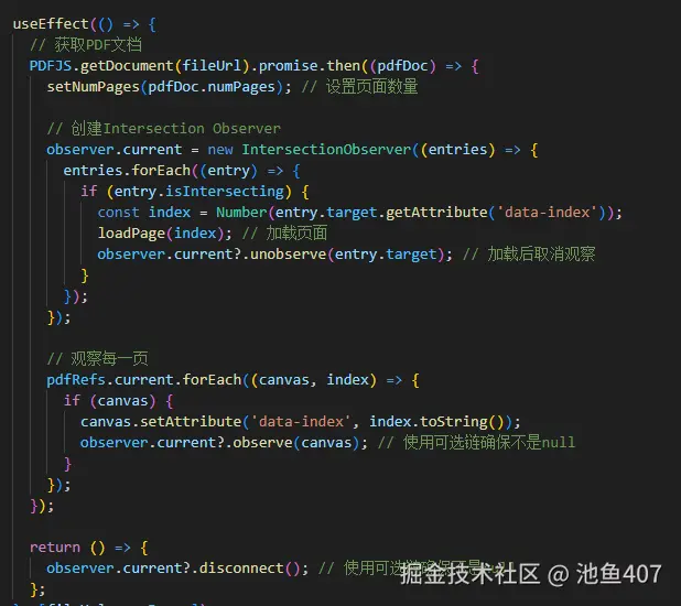 为了避免一次性渲染所有 PDF 页面,我引入了 Intersection Observer。当用户滚动浏览 PDF 文档时,只有当前视口中的页面才会被渲染,这大大减少了不必要的资源消耗。