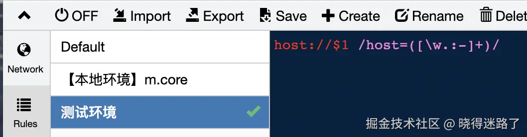 可以看到这个插件主要用到了 jsPrepend 在 html 中引入调试工具。whistle.inspect 插件安装完成后,就可以在 Rules 中配置规则。
