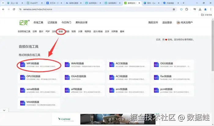 步骤一: 打开浏览器,访问记灵在线工具的官方网站。在官方网站上找到 【音频】 → 【MP3转换器】 ,点击打开。
