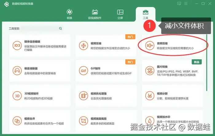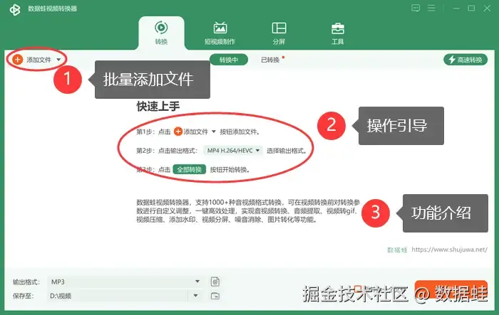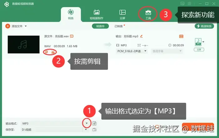把音乐转换成MP3格式已是大势所趋。怎么把音乐转换成mp3格式?数据 蛙视频转换器就是音频转换的不二之选。该软件UI设计简洁清楚,引导教程完备,即使是从没接触过格式转换的用户也可以根据主页面的步骤一步一步完成格式转换。除基本的格式转换外,用户还可以按照自己的兴趣尽情在 【工具箱】 摸索各式丰富有趣的功能,为自己的内容创造之路提供思路。