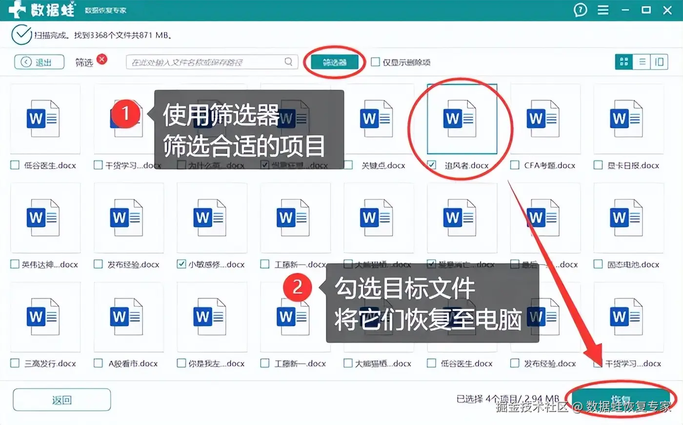 步骤3:等待一段时间,你可以在新的界面中看到一份列表。在列表中,你可以使用筛选器,筛选出合适的项目。然后勾选这些文件,点击 【恢复】 ,保存到电脑指定文件夹中。