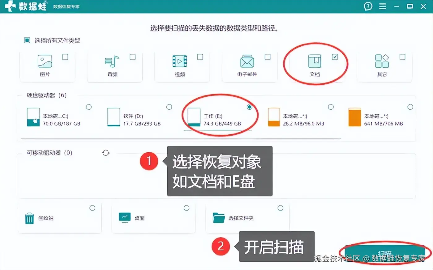 步骤2:双击桌面图标,运行程序。在新的界面中,你需要选择丢失数据的类型和磁盘,然后再点击 【扫描】 。