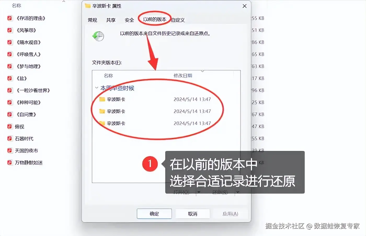 步骤2:点击 【查看以前的版本】 按钮,在历史版本列表中选择一个版本,然后点击 【还原】 。