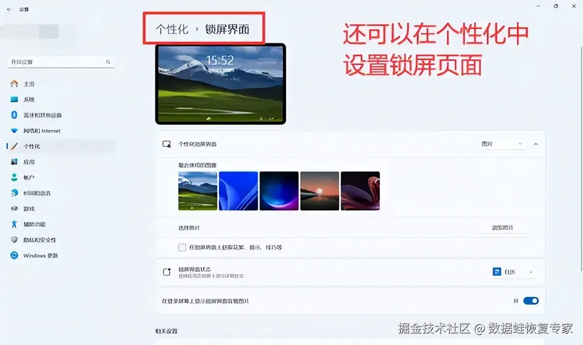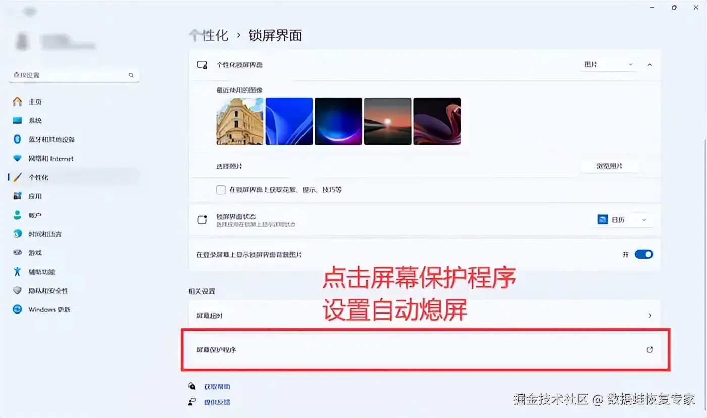第四步:如果你觉得锁屏太单一,也可以进入 【个性化】-【锁屏界面】 ,选择你喜欢的锁屏方式和屏保画面等。