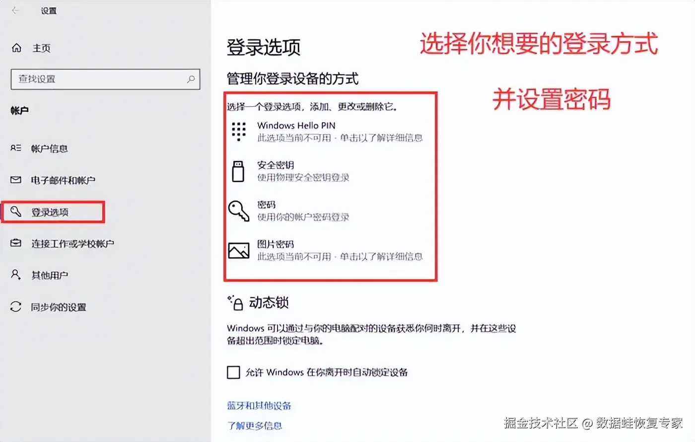 第三步:在登录选项中,你可以选择锁屏密码的样式。例如点击 【安全密钥】 ,系统将会提示你输入新的密码并确认。