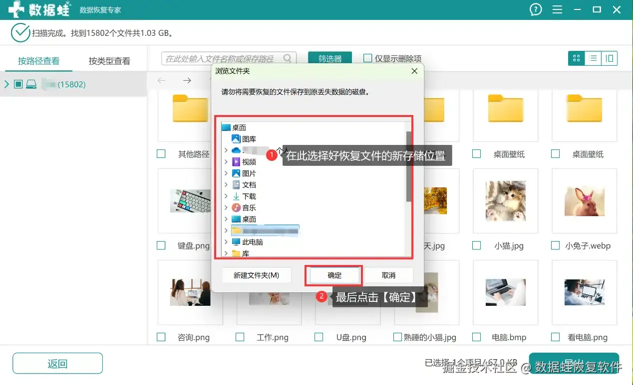 步骤3: 点击【导出】后,选择恢复文件的存储位置。