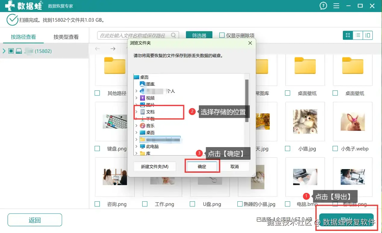 第3步: 选定文件后点【导出】,最后在弹窗选好恢复文件的存储路径,完成硬盘文件恢复。
