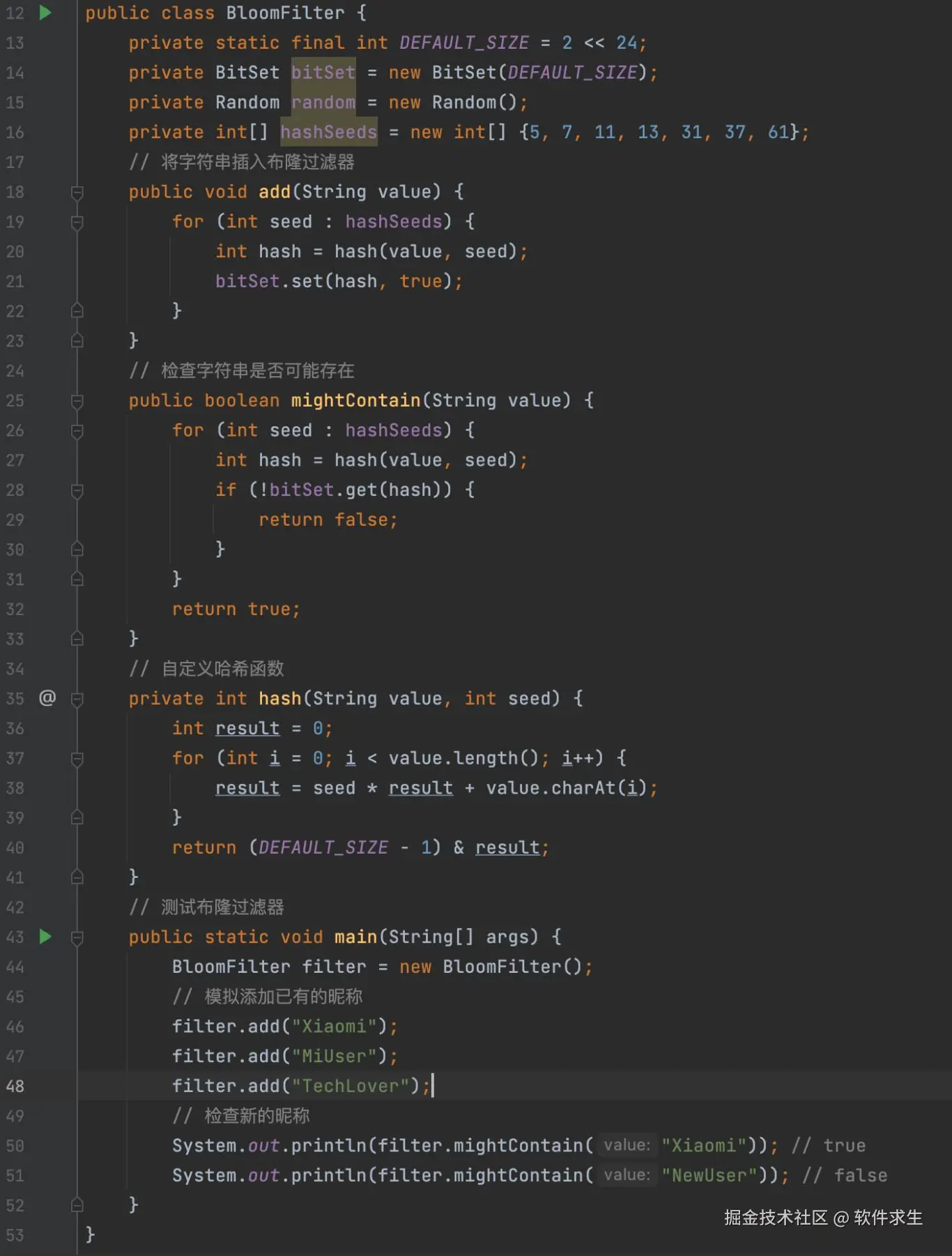 接下来,让我为大家展示一个简单的布隆过滤器实现,用于昵称管理。我们将使用Java来编写这个示例代码: