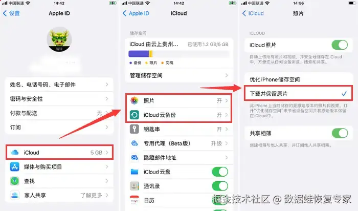 操作步骤:进入iPhone上的 【设置】>【Apple ID】>【iCloud】>【照片】 ,开启 【下载并保留原片】 选项,iCloud会自动将照片同步回你的设备。