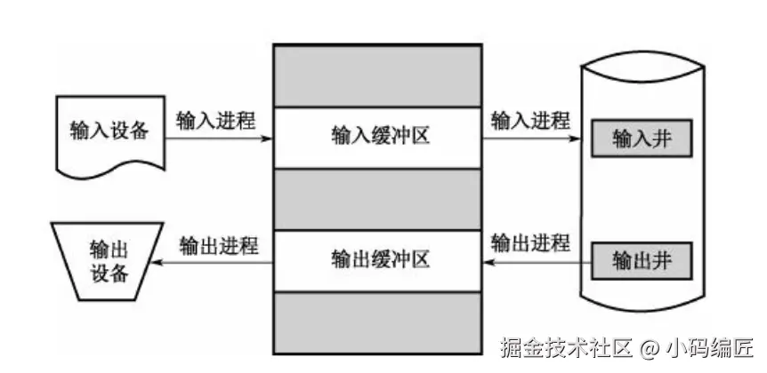 采用假脱机技术, 可以将低速的独占设备改造成一种可共享的设备, 而且一台物理设备可以对应若干台虚拟的同类设备。 假脱机( Simultaneous Peripheral Operation On Line, SPOOLING) 的意思是外部设备同时联机操作, 又称为假脱机输入/输出操作, 采用一组程序或进程模拟一台输入/输出处理器。