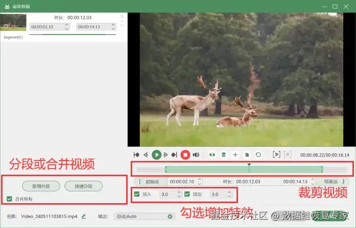 步骤4:结束录制后,可以在 【预览窗口】 浏览录制的视频,也可以点击下方的 【高级剪辑】 进入对视频进行分段、裁剪、添加特效等处理。