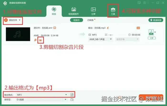 数据 蛙视频转换器深耕格式转换领域多年,在视频转换之外,它还是一款专业的mp3转换器。怎么在线转换mp3?来看它大显身手!在音频转换领域,该视频转换器有以下优点: