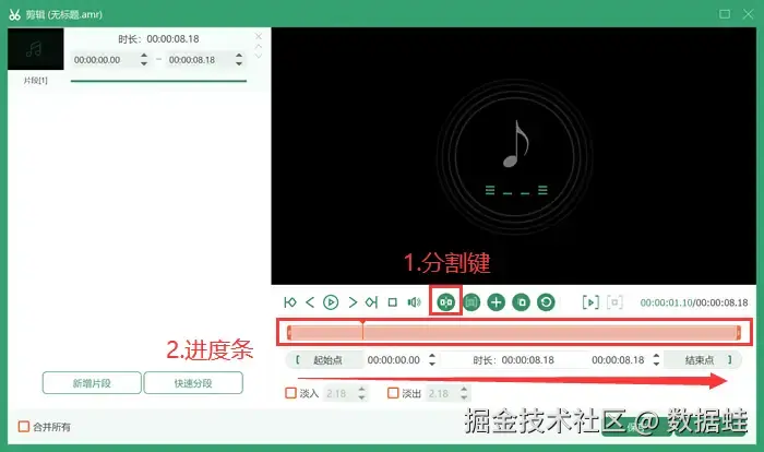 步骤三: 选择 【输出格式】 选项,在弹出的菜单中找到 【mp3】 ,将其设定为目标格式。若原始的音频文件有杂音,可以点击 【剪辑】 ,使用 【分割】 键分割杂音,使音频更加纯净。