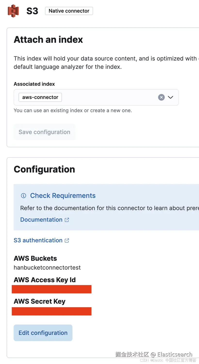我只需跳转到我的 Elastic Cloud 部署,转到 Search -> Content -> Connectors,然后使用所有默认设置创建一个名为 aws-connector 的新连接器。然后,我将打开配置并添加我的存储桶的名称以及标记到我的 AWS 用户的密钥和访问密钥。