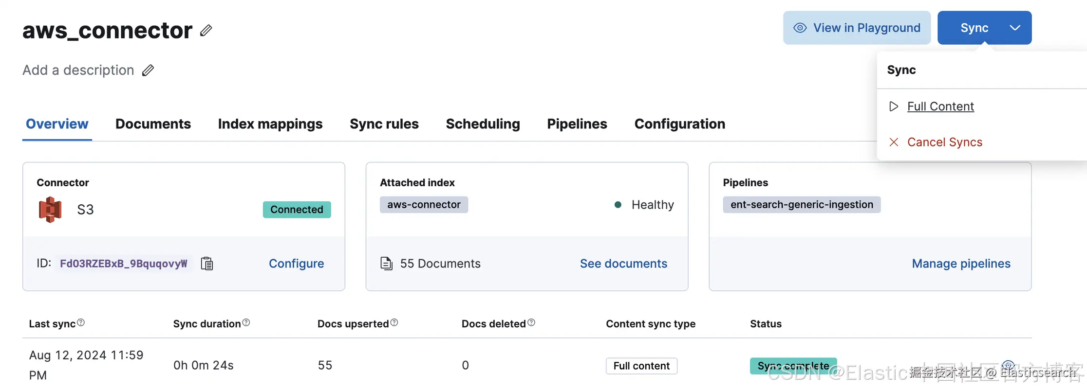 运行快速同步以验证一切是否正常。同步将提取数据源中每个未提取的文件,提取其内容,并将其作为唯一文档存储在索引中。每个文档都将包含其原始文件名。与现有索引文档具有相同文件名的数据源文档不会被重新提取,所以不用担心!同步也可以定期安排。该方法在文档中描述。如果一切正常,假设我的 AWS 凭证和权限都正确无误,数据将进入名为 aws-connector 的索引。