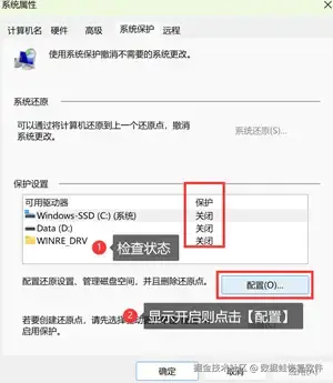 步骤2: 在系统保护界面可先查看该功能的状态,如开启,则点击【配置】,进入新页面后按照计算机的指示继续操作。