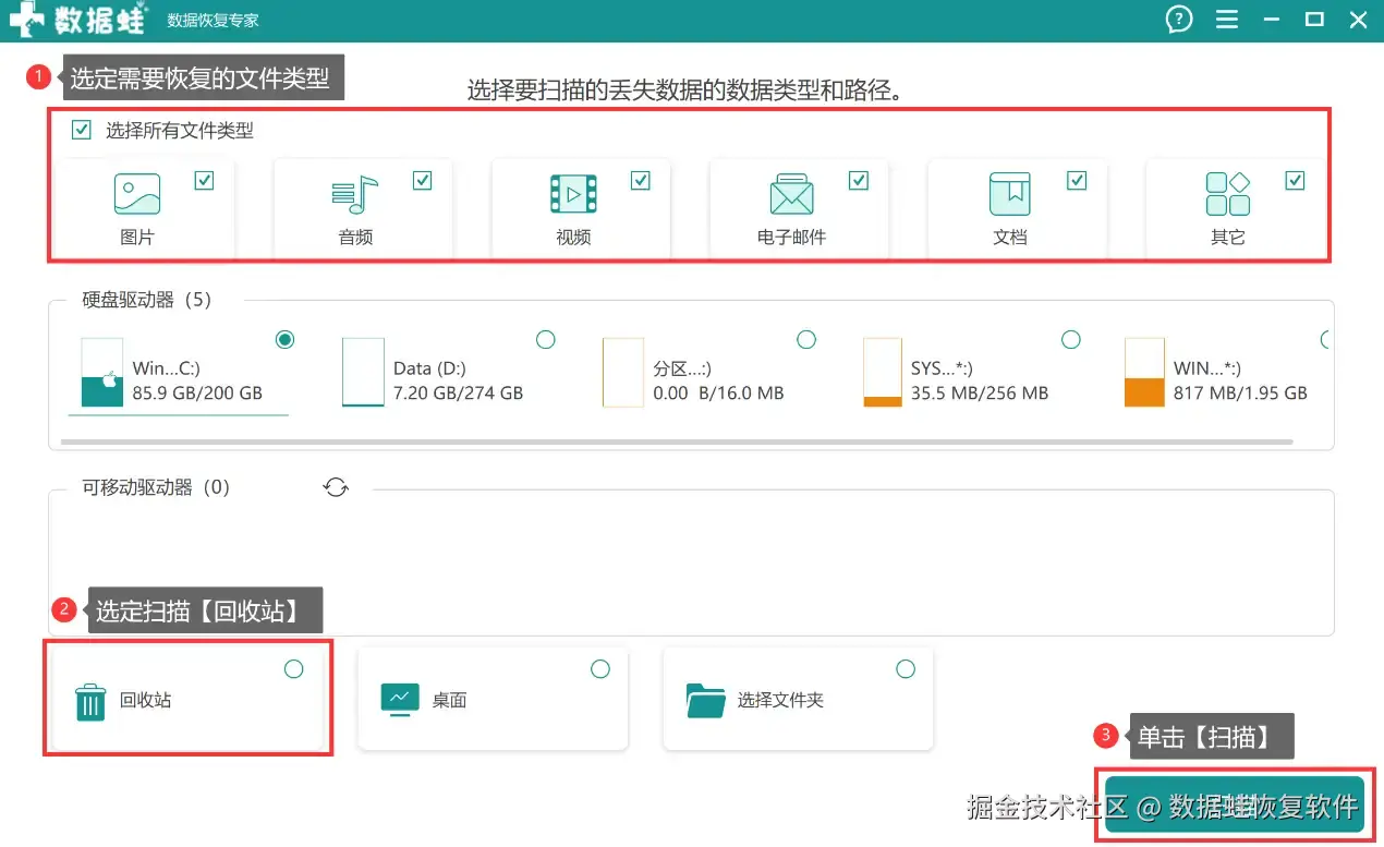 回收站清空的文件怎么找回?使用数据 蛙恢复专家,只需要三步,就能够完成回收站文件恢复的流程: