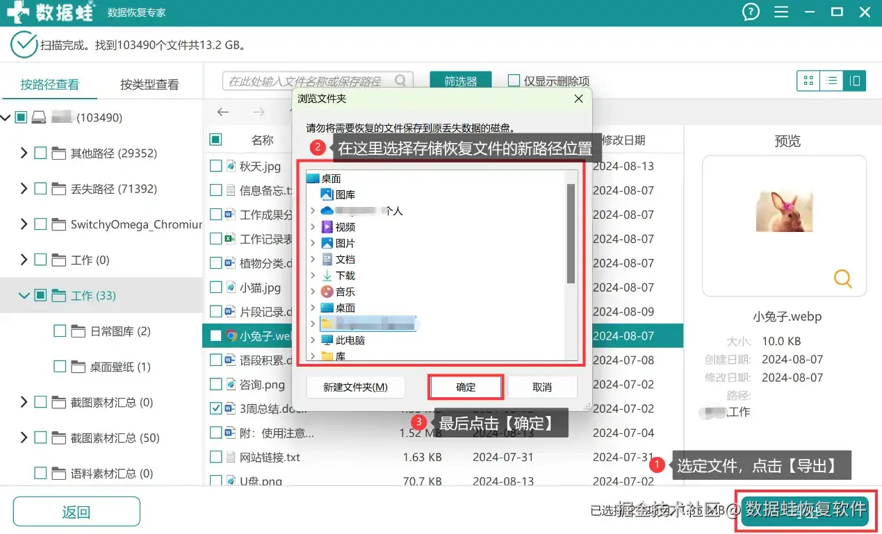 第3步: 选定需要恢复的目标文件后,点击【导出】,再为其选择新的存储路径即可。
