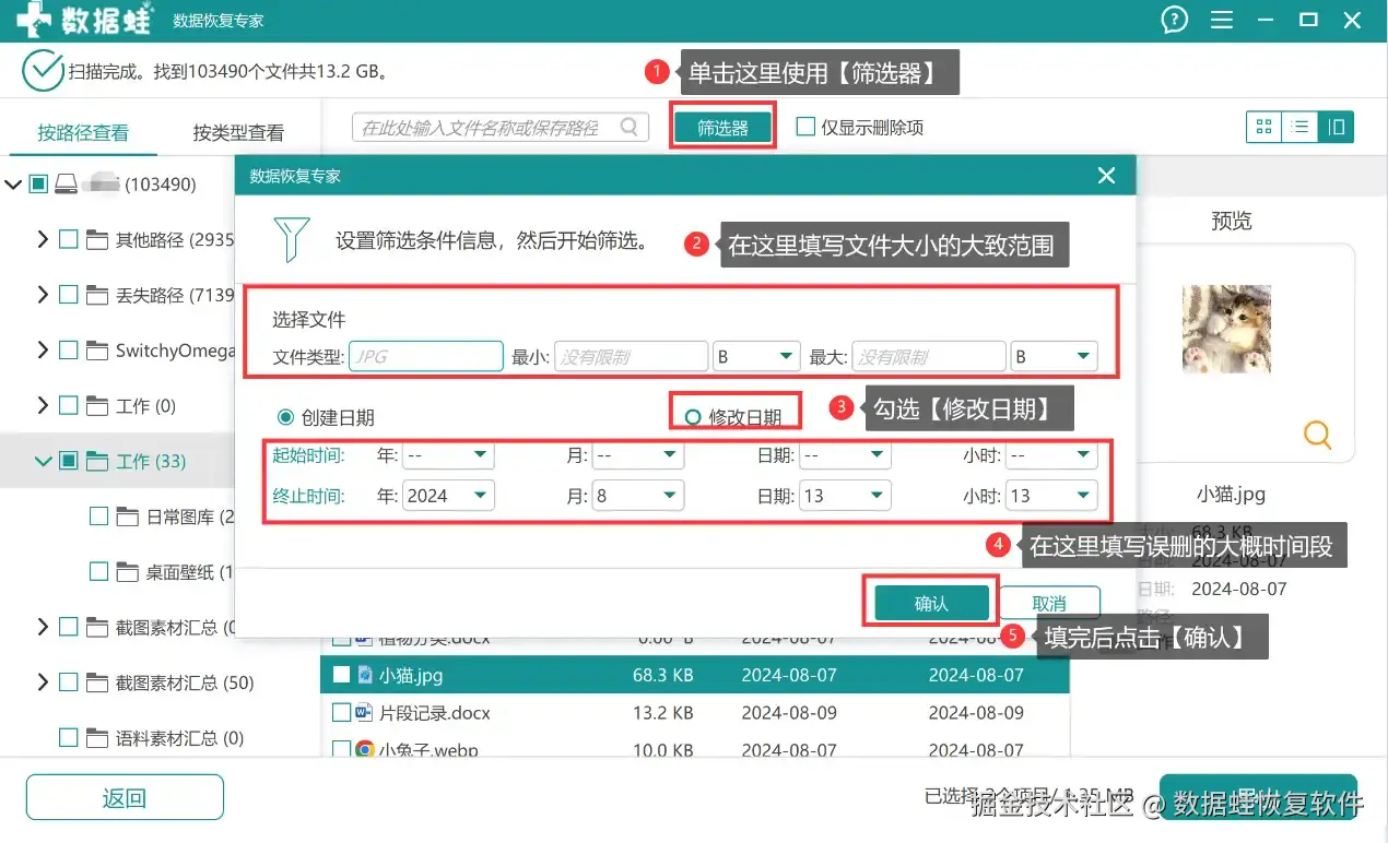 第2步: 等待软件扫描结束后,可以选择使用【筛选器】功能去帮助你找到当时误删的文件。