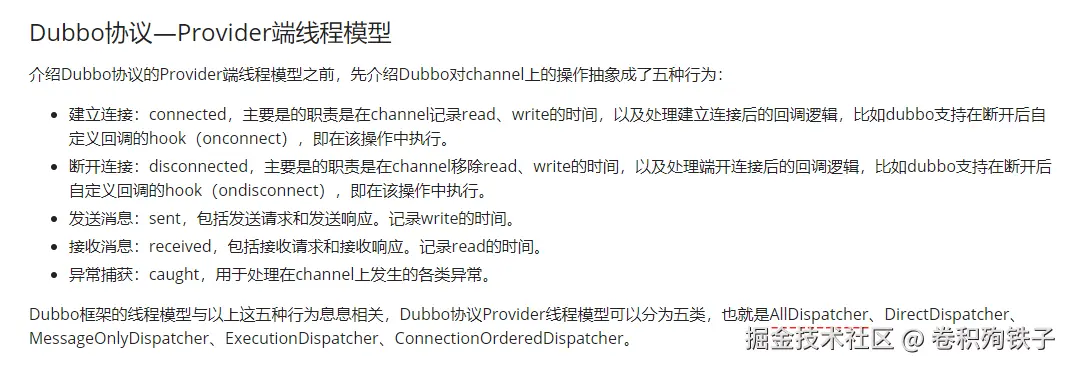Dubbo 协议 Provider 线程模型的默认配置是 AllDispatcher。