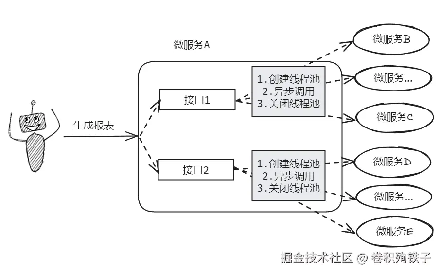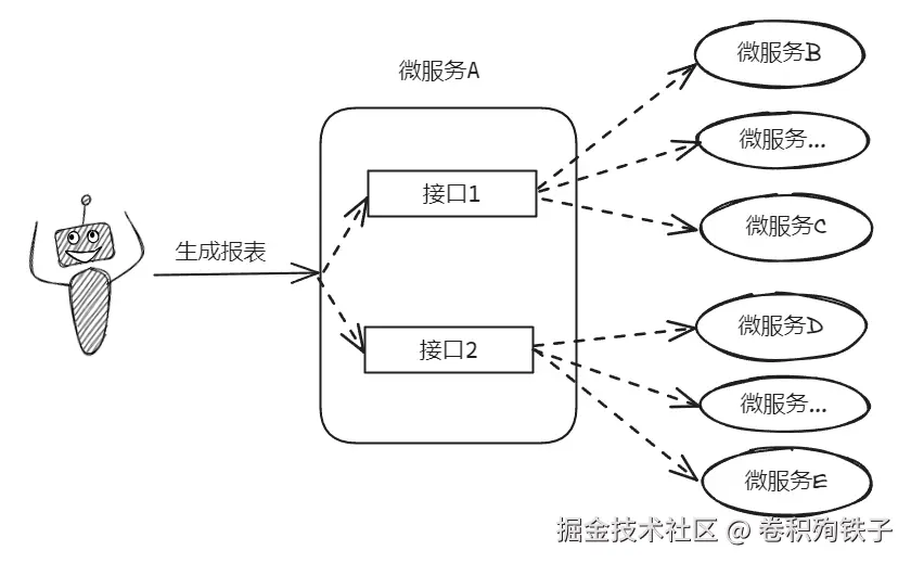 前端发起一个生成报表页面的请求,这个页面上的数据由后端多个接口返回,另外由于微服务化了,所以数据散落在每个微服务中,因此需要调用多个下游接口拿到数据进行整合。