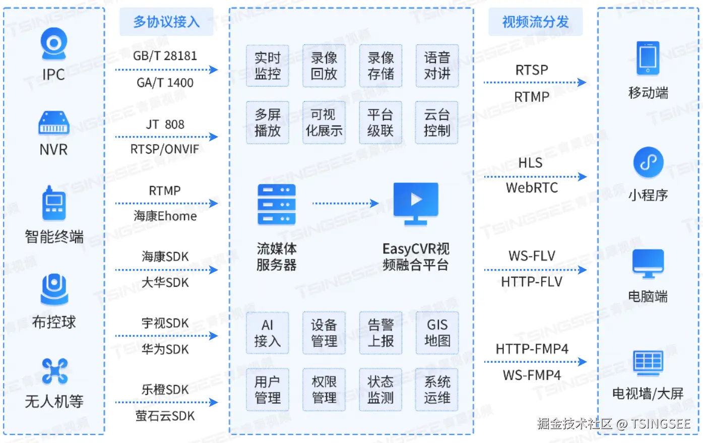 流媒体管理系统EasyCVR视频融合平台在多个领域具有广泛的应用场景。在智慧城市和数字乡村建设中,通过平台级联与扩展,可以实现多平台互联互通和数据共享,为城市治理和乡村管理提供高效稳定的视频服务。在智慧交通、智慧安防、智慧环保等领域,平台可以实时传输高清视频流,助力城市管理者实现精准决策和高效管理。