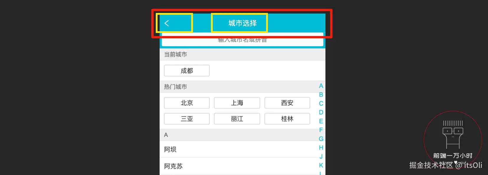 城市选择页的头部与首页头部类似,仅分为左边的“返回”图标,和居中显示的“城市选择”:
