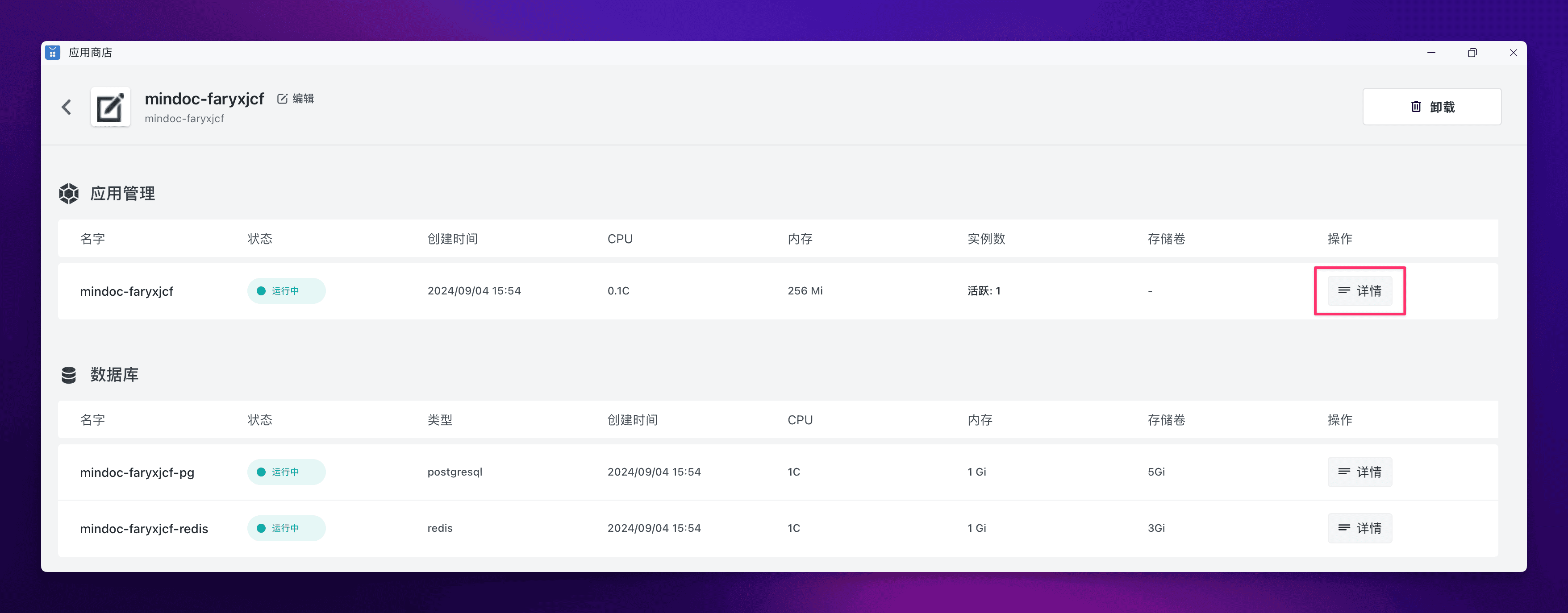 啥也不需要填,直接点击右上角的 “部署应用” 开始部署。部署完成后,等待所有组件都变成 “运行中” 状态,然后点击应用的 “详情” 进入该应用的详情页面。