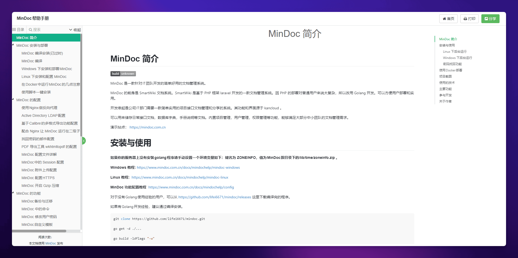 MinDoc 是专为咱们 IT 打工人设计的文档管理系统。它的前身叫 SmartWiki,是用 PHP 搞的。但是吧,PHP 部署起来有点小烦,所以大佬们就用 Golang 重写了一遍,于是 MinDoc 就诞生了。
