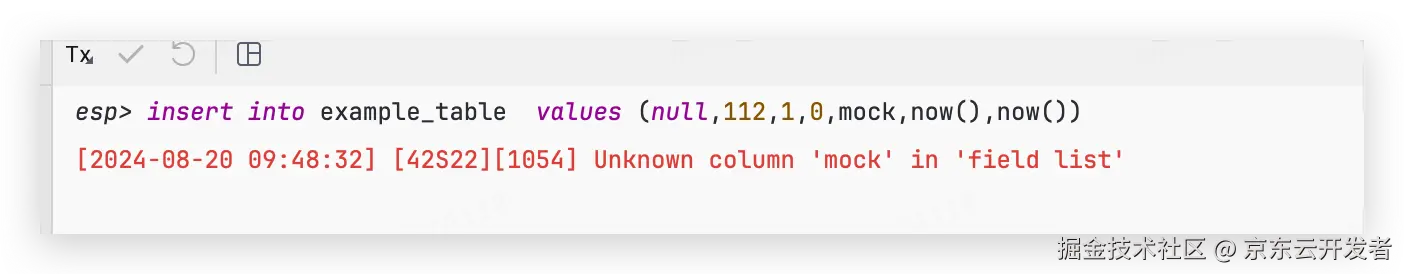 主键还是连续自增的。这个发生错误为什么自增主键还是连续的呢。我们模拟一下之前联调遇到的情况,插入一条 sql: