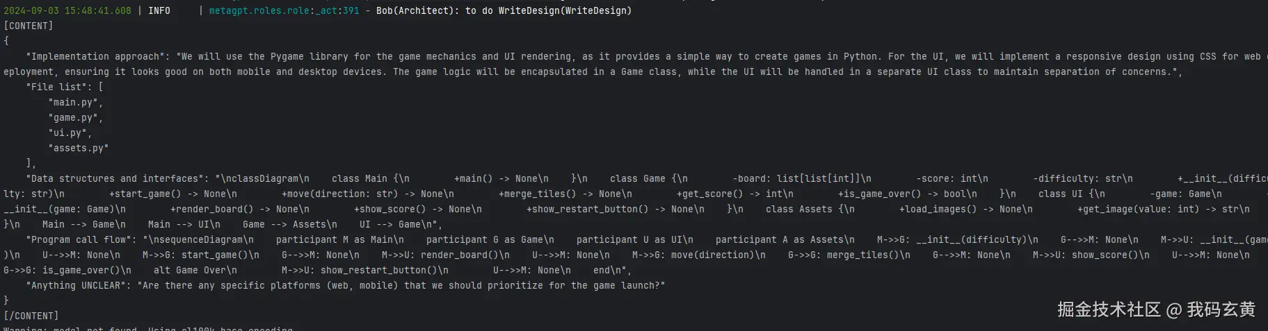 可以看到整个一个流程由 MetaGPT 模拟角色自主的完成。
