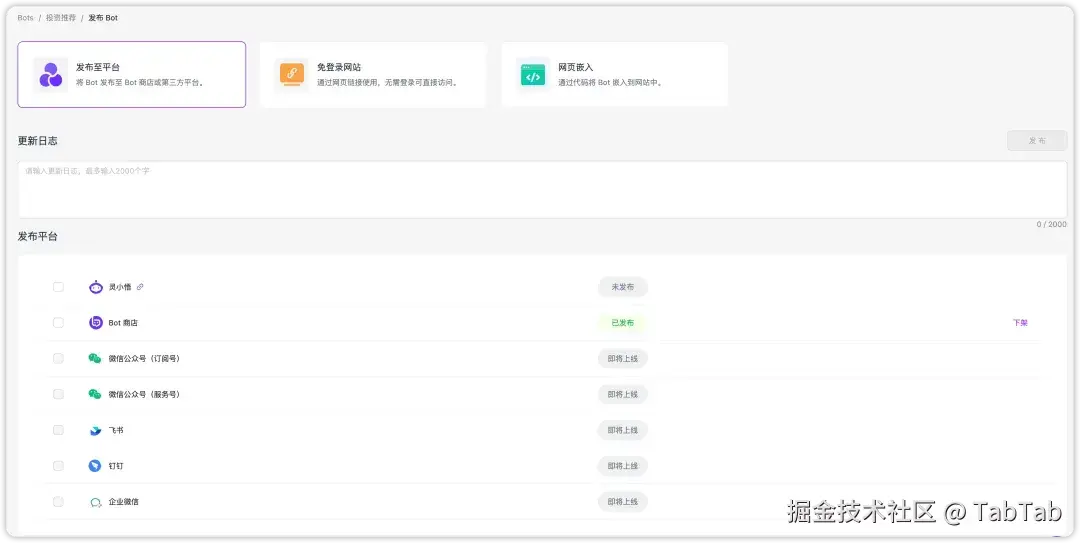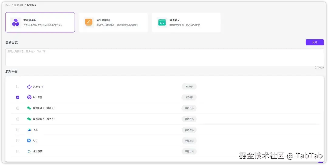在 Bot 模块完成 Bot 创建后,您需要将您的 Bot 发布至 Bot 商店中;