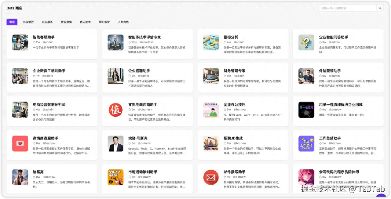 我们推出了全新的 Bot 商店,在这里,您可以轻松浏览和体验 官方或其他用户 发布的各类 Bots!