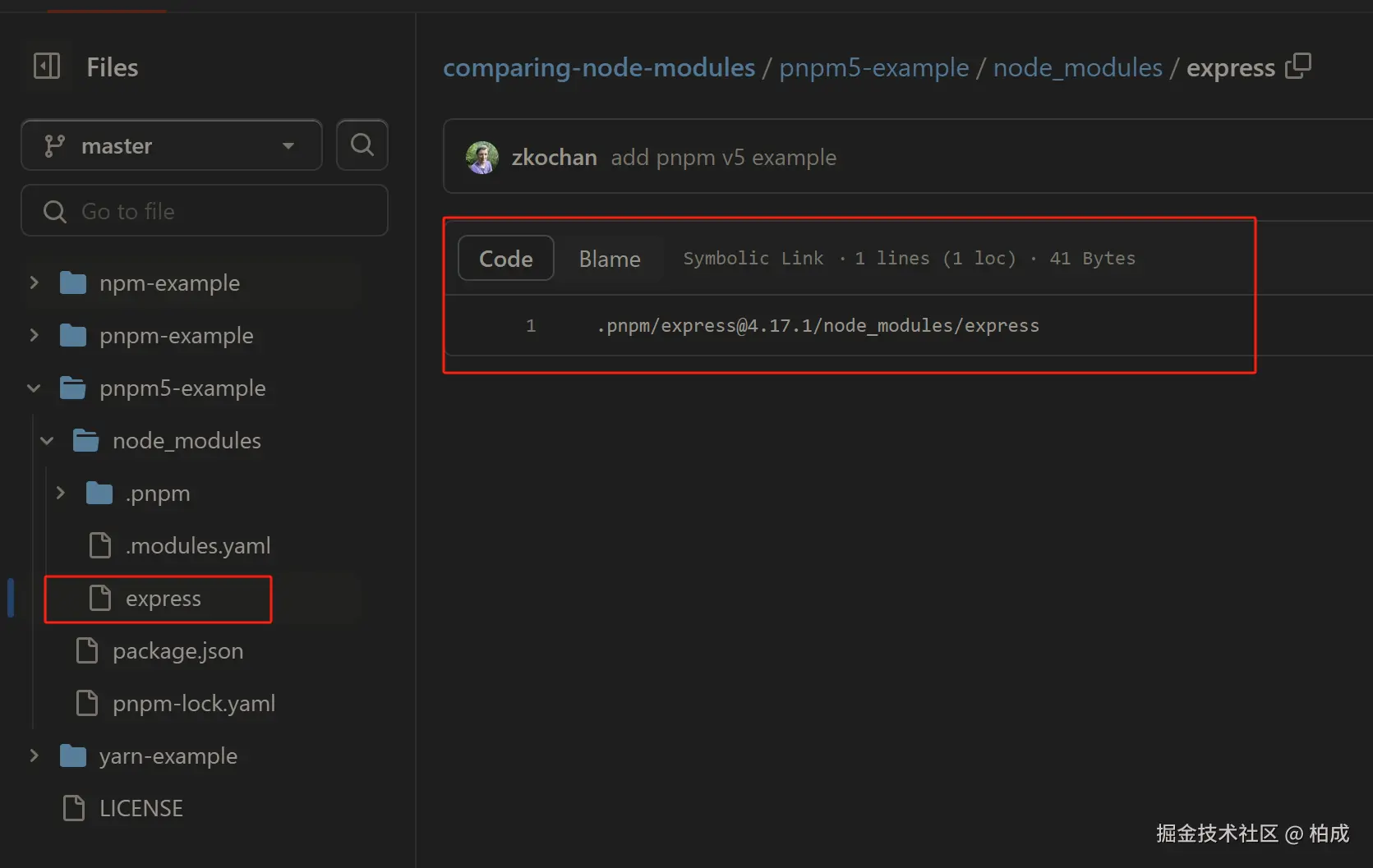 执行 npm add express,我们可以在 pnpm-example 看到整个目录,由于只安装了 express,那 node_modules 下就只有 express